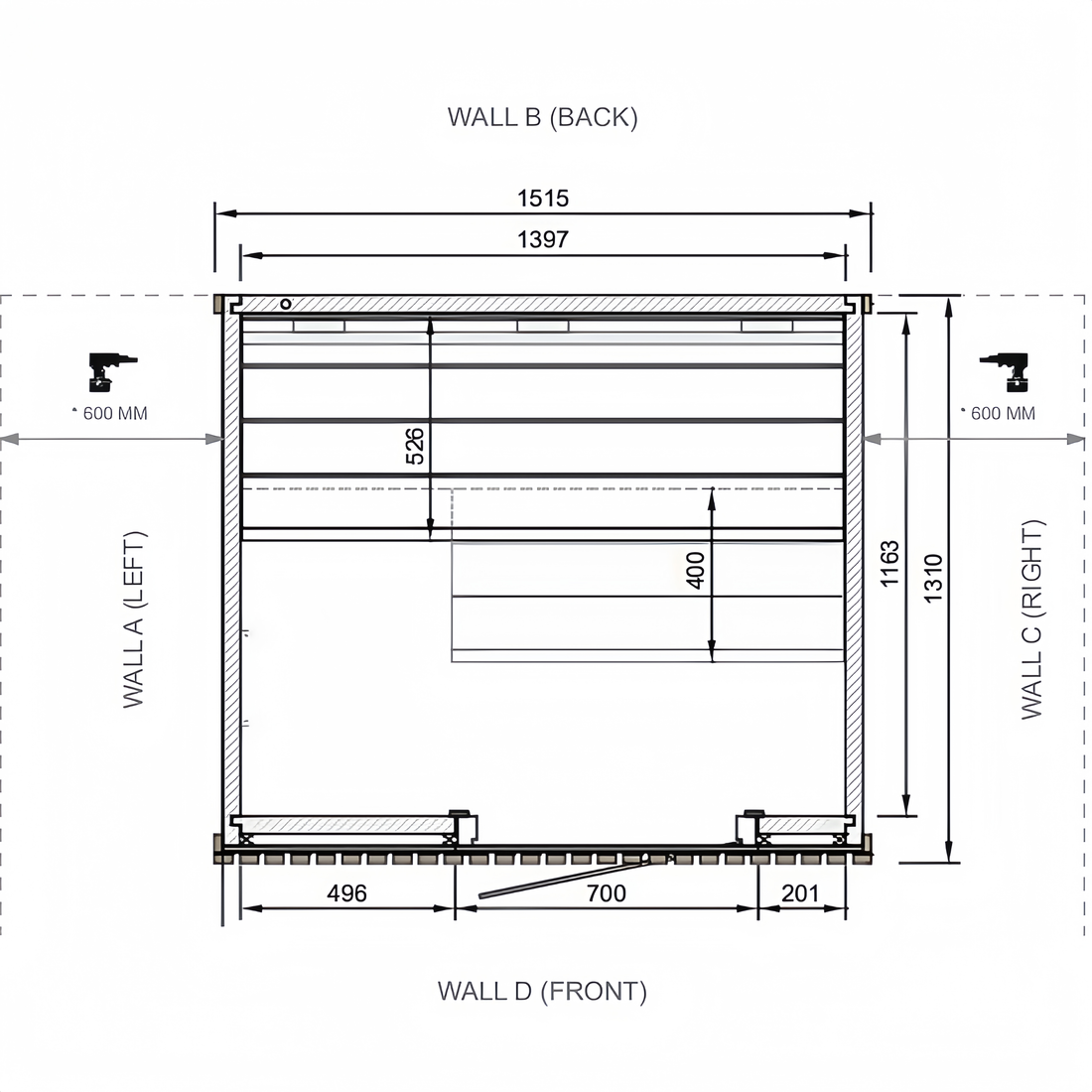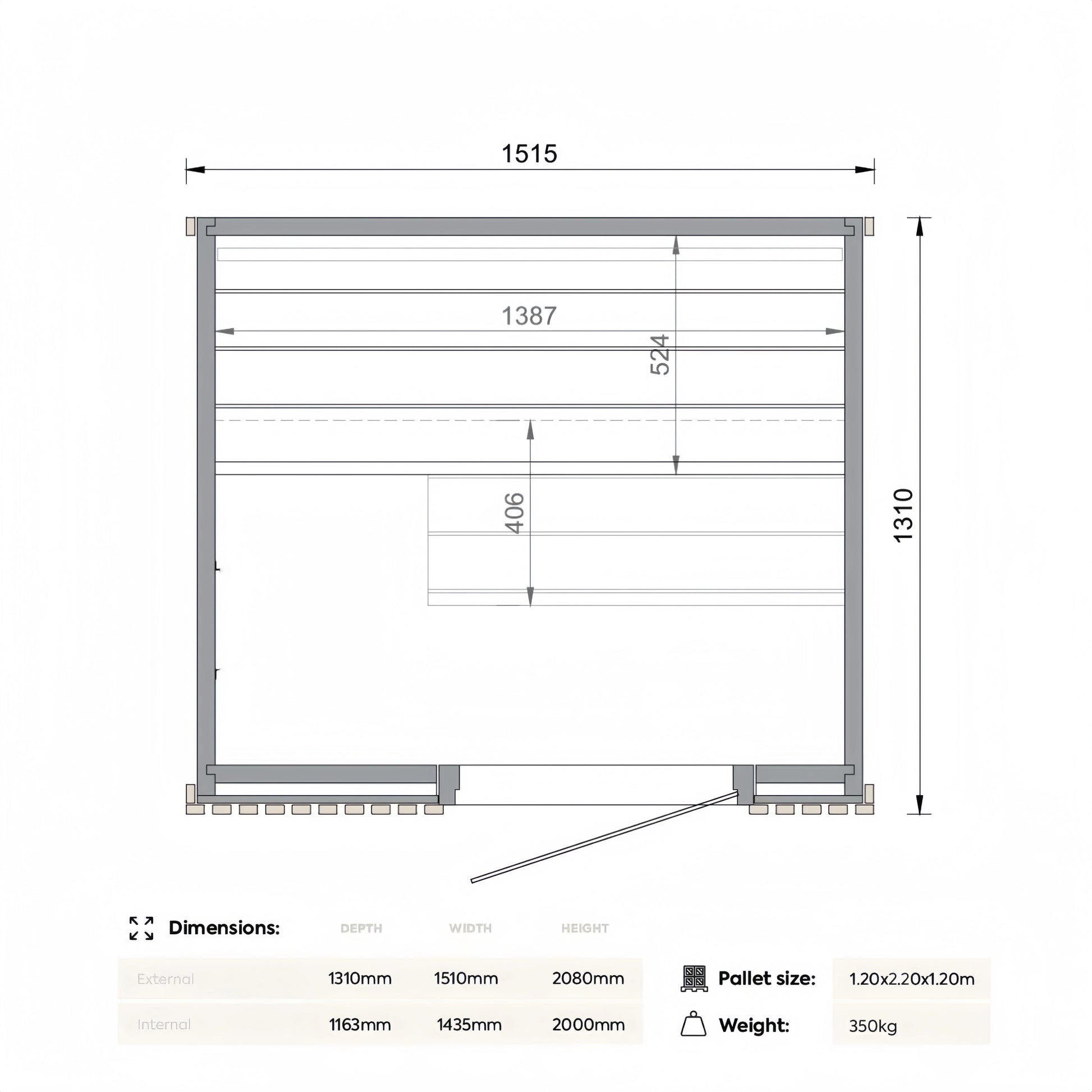 | Internal Dimensions (W x D x H) | 1435 mm x 1163 mm x 2000 mm |