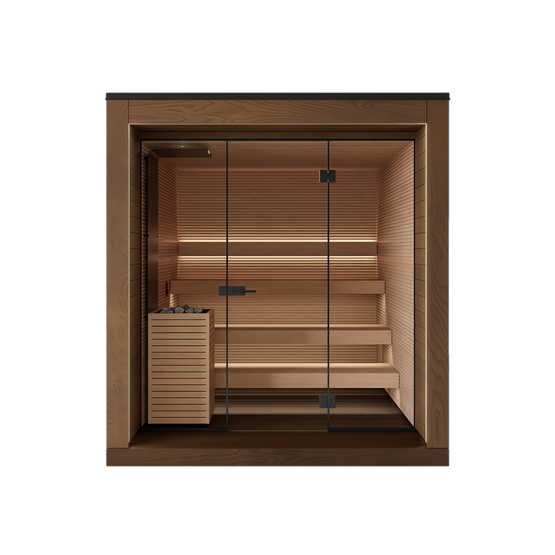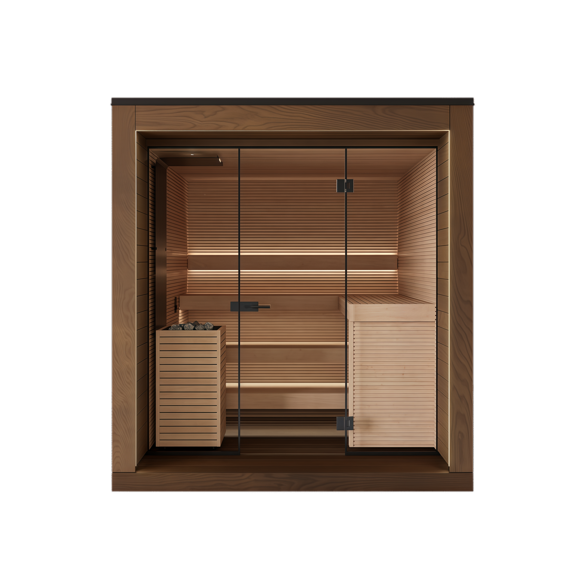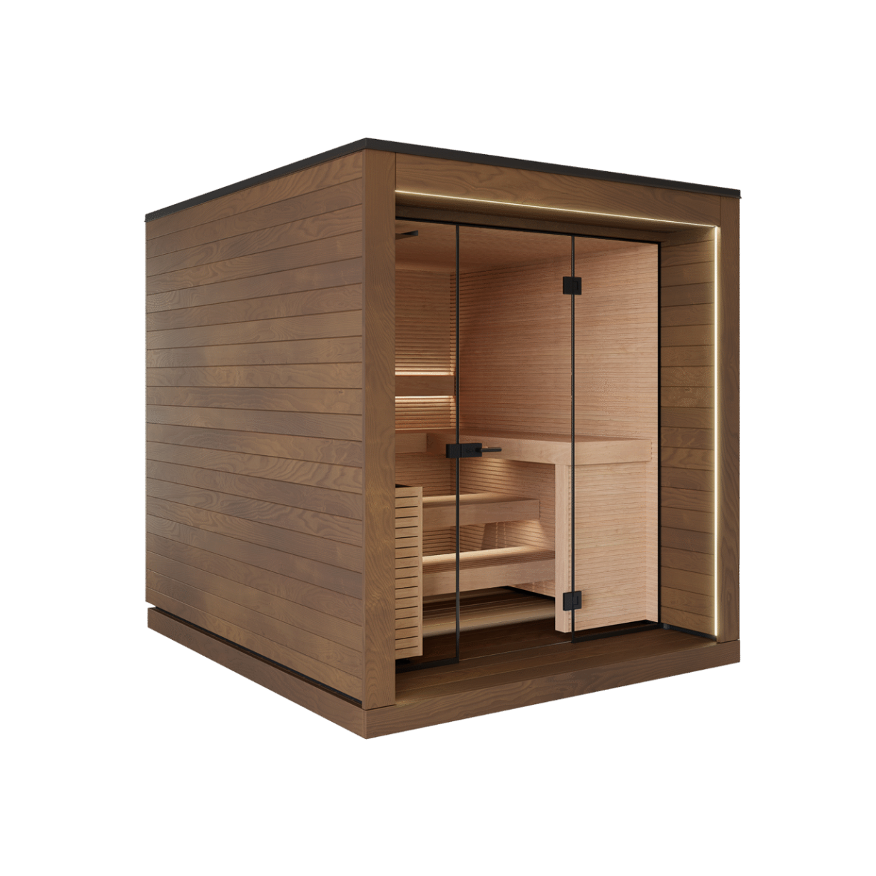 Glass doors and recessed lighting add a modern and airy feel to the interior, allowing light and natural views to blend seamlessly into every thermal experience. Whether nestled in the mountains or in a lakeside courtyard, this sauna room can become a quiet and powerful retreat – a place where one can unwind from fatigue and return to balance and tranquility amidst the aroma of wood and the heat.