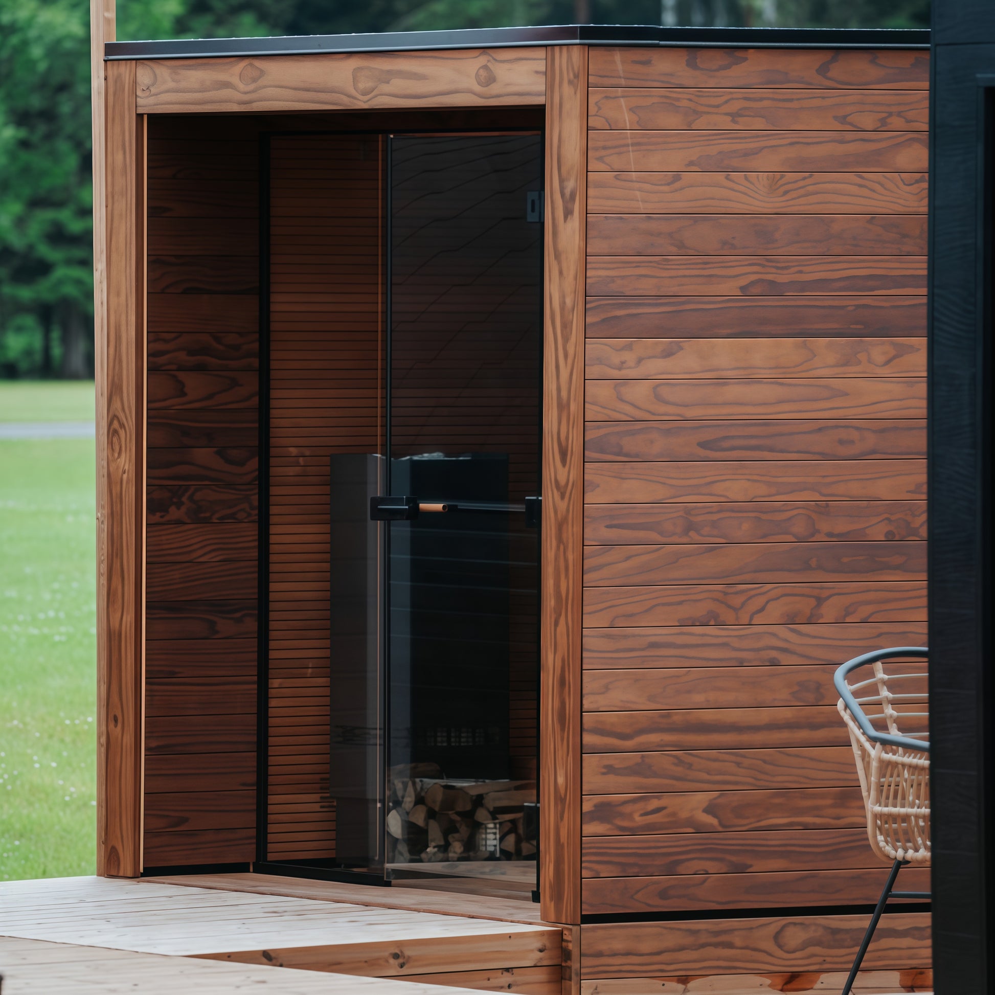 This outdoor sauna embodies a balance between nature and modernity through pure architectural language. The overall structure features clean lines and elegant proportions, while its minimalist design allows materials and light and shadow to take center stage.