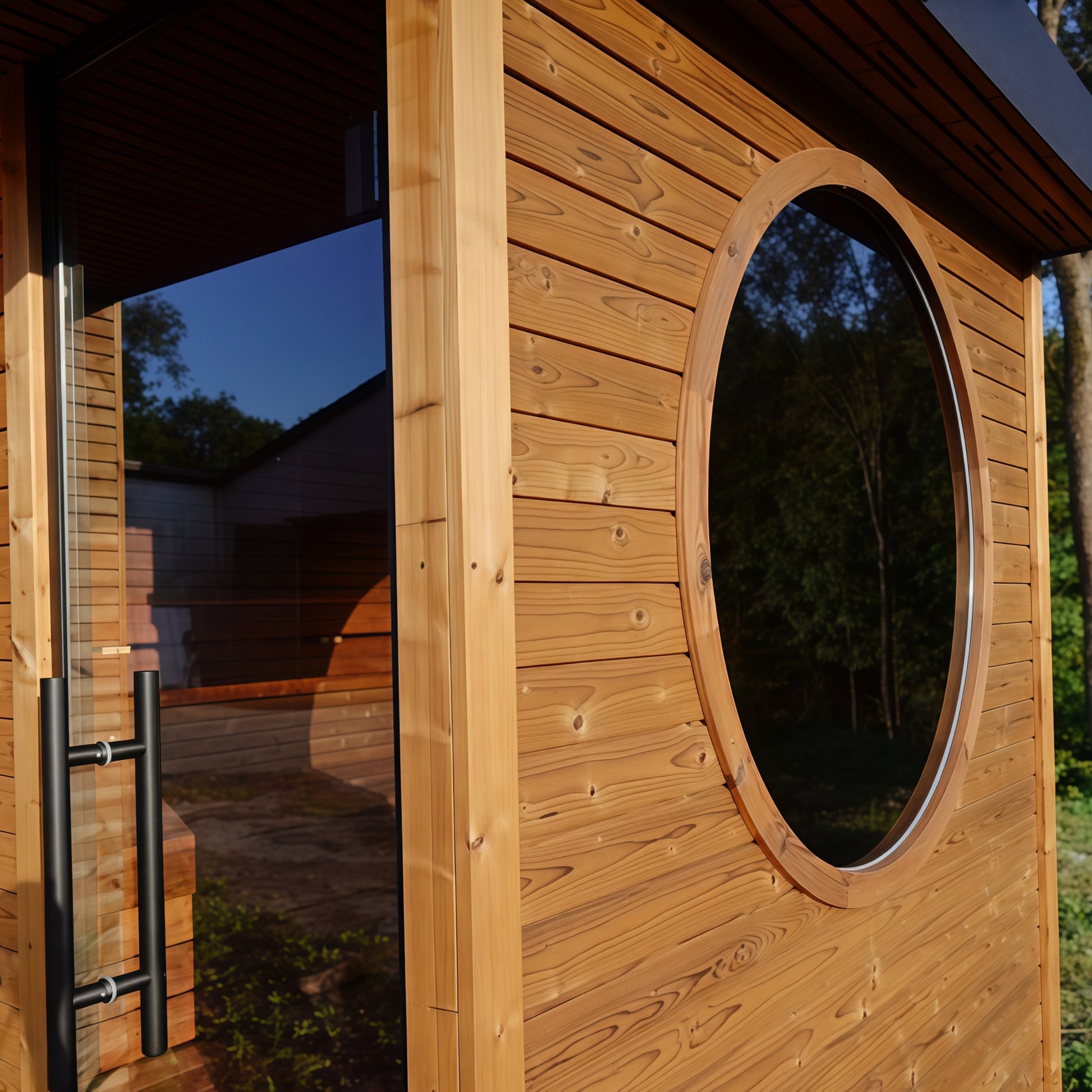 HORIZEN outdoor sauna rooms blend modern architectural aesthetics with Eastern Zen philosophy, creating a tranquil space exclusively for nature and the soul. The exterior walls are constructed from durable red cedar or hemlock, showcasing a warm and natural wood grain texture that is both rot-resistant and weather-resistant, brimming with the vitality of raw wood.