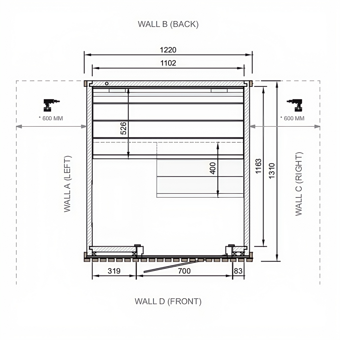 | Internal Dimensions (W x D x H) | 1140 mm x 1163 mm x 2000 mm |